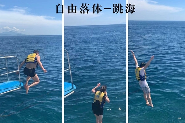 半小時后,我們首先到達了海中間由兩艘游輪搭建的漂浮“海上游玩基地”,除了“香蕉船”“甜甜圈”和“浮潛”這些項目,最有意思的是“跳海”,作為非專業隊員,大家入水姿勢各異,激起巨大的浪花。遺憾的是,“女神”曹總并沒有參與“跳?!?,估計她是為大家著想,怕入水海平面升高2米,淹沒“基地”,多年以后,我還是要感謝曹總的“不淹之恩”,讓我依然可以坐在在夕陽下回憶往昔。